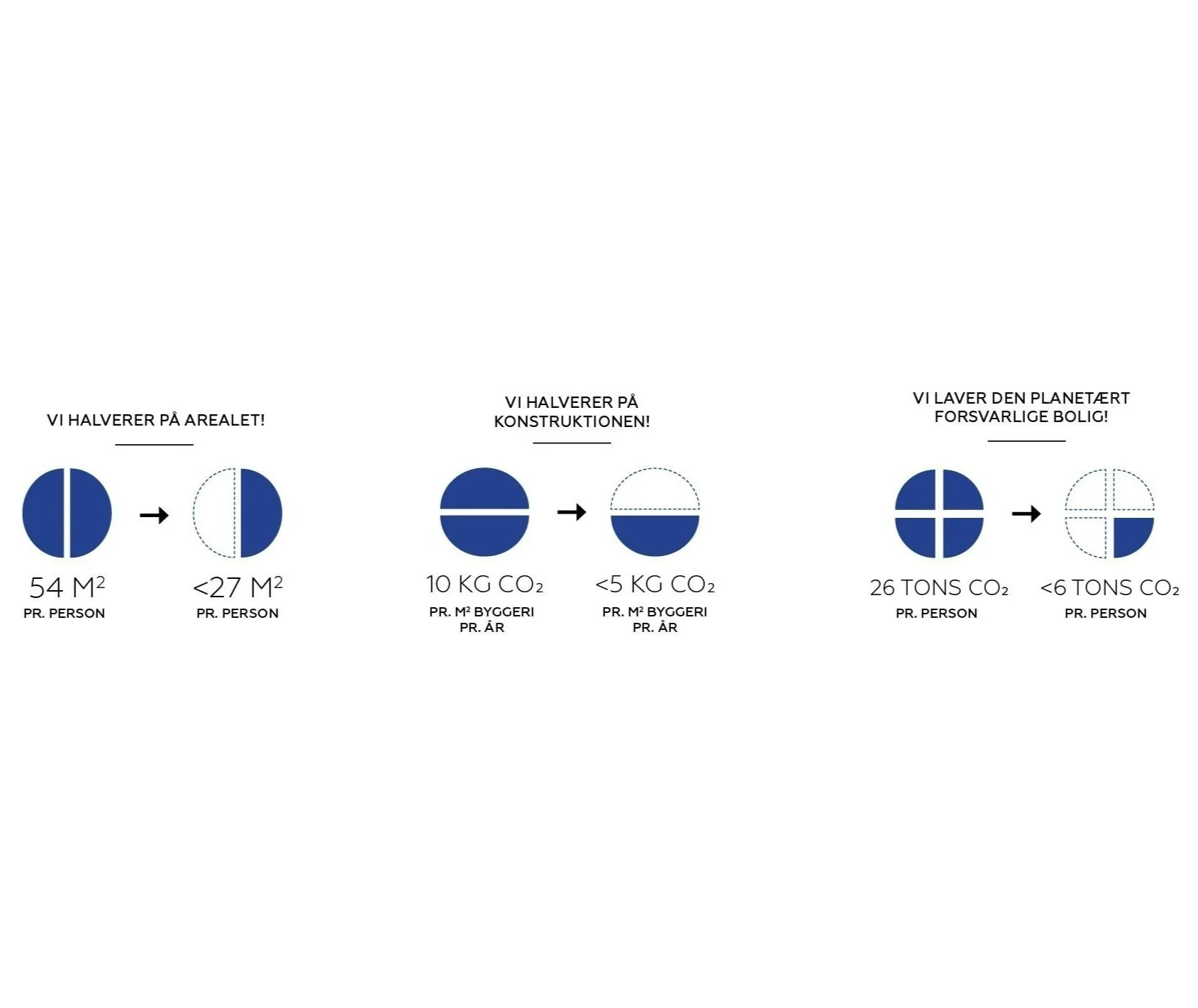 Gennemsnitligt for bebyggelsen vil boligarealforbruget være mere end halveret ift. de 54 m²/person vi i Danmark - som europæiske rekordholdere - benytter i dag.